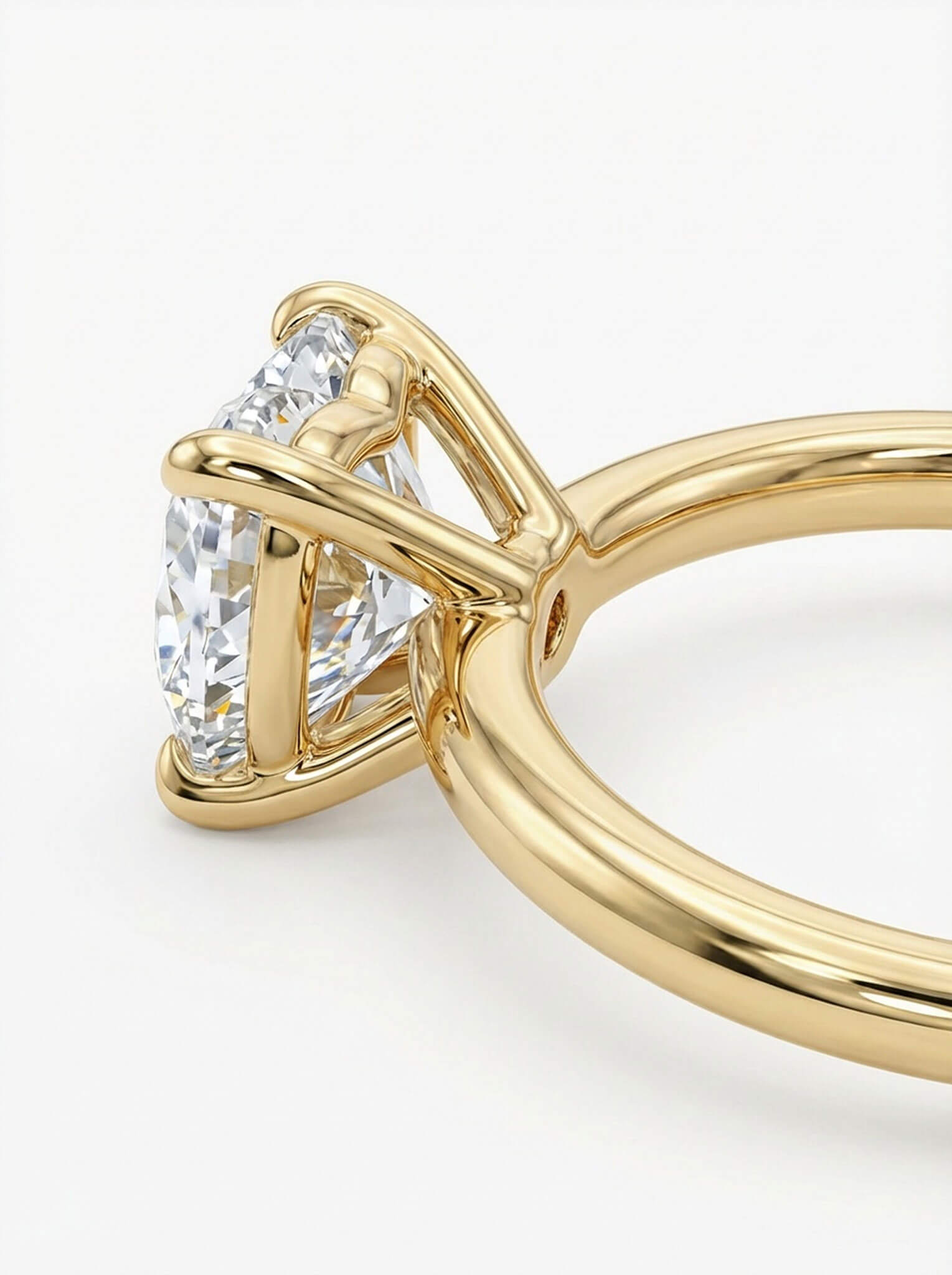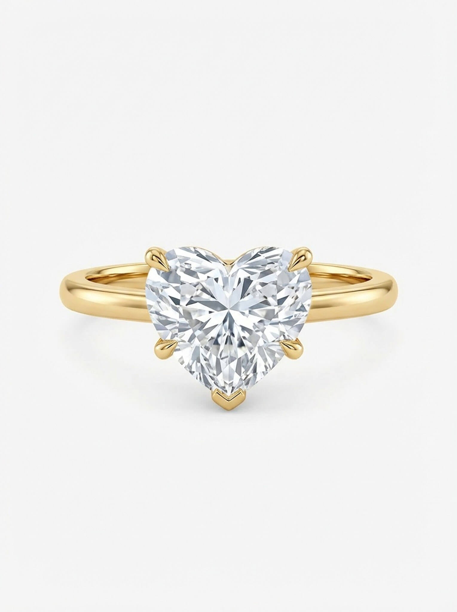 At its centre sits a heart-shaped diamond ranging from 1–5 carats. We offer a curated selection of premium, high-grade diamonds alongside other consciously created options — all produced with full transparency from growth through cut, polish, and setting.
